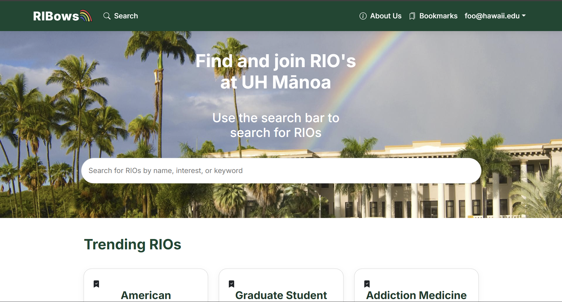 This project is a HTML, CSS, and Typescript project that me and a couple other of my classmates created in ICS 314 Software Engineering in Fall 2026. This project allows users to search directly for an RIO that they want to join, as well as filters like trending and type of RIO. This program also allows clubs to have their own account and edit their own information in case the spreadsheet that the database is using has any incorrect or not up to date information.